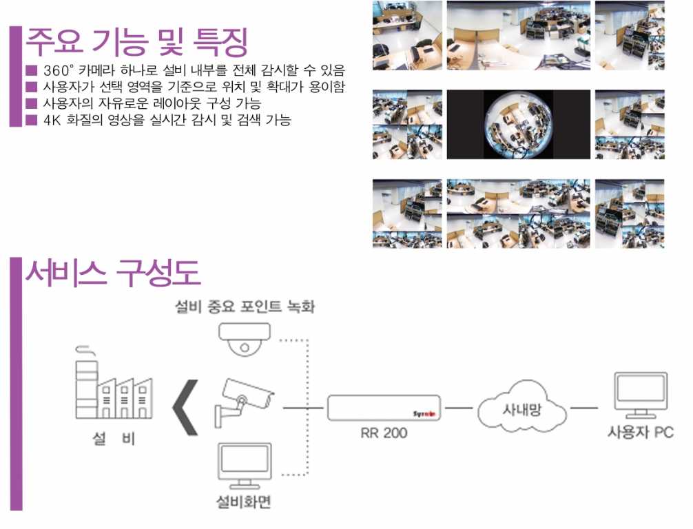 고해상도 360° 카메라를 이용하여 설비 내부를 빈틈없이 실시간 감시 및 검색